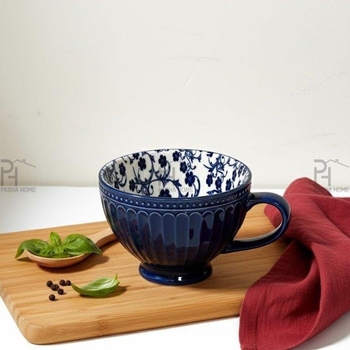 فنجان سرامیکی با طراحی گل‌دار کلاسیک و رنگ لاجوردی، مناسب سرو چای و دمنوش. مقاوم، زیبا و قابل‌استفاده در مهمانی یا روزمره.