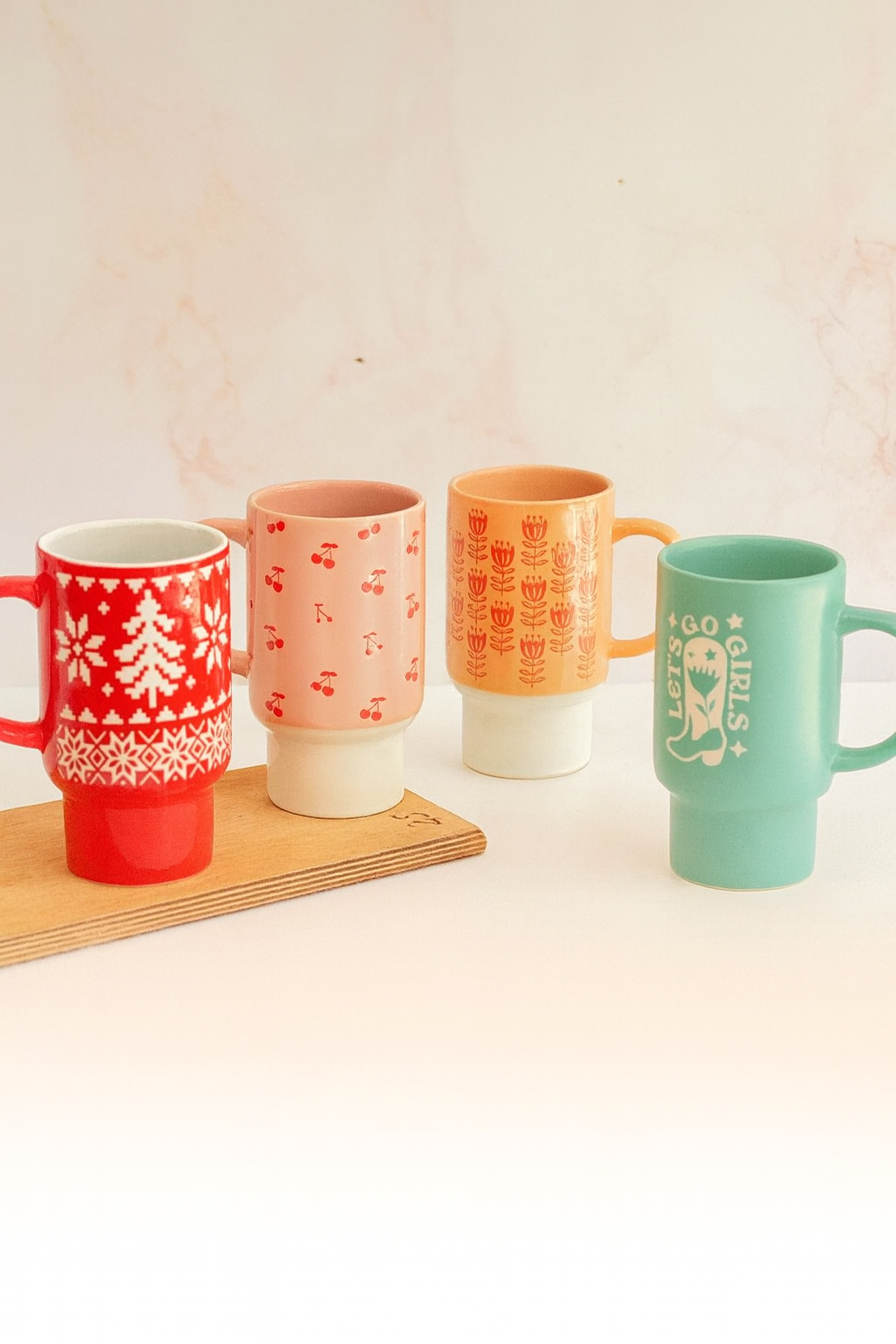 ماگ بلند پایهدار فانتزی با طراحی رنگی و چاپ ماندگار، مناسب نوشیدن قهوه یا چای و ایدهآل برای استفاده روزانه، میز کار و هدیه. استایل مدرن، فرم کاربردی و ظاهر چشمگیر.